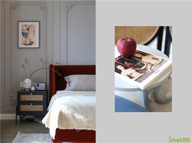 書柜位置以玻璃柜和造型柜門板結合出現(xiàn),將空間的呼吸感呈現(xiàn)出來。梯形柜體既緩解了中央空調(diào)形成下壓空又增強空間的包圍感;書桌整體以皮質(zhì)出現(xiàn),因地插壞掉的幾率較高,故插座接線提高到書桌柜體側(cè)面。室內(nèi)設計師