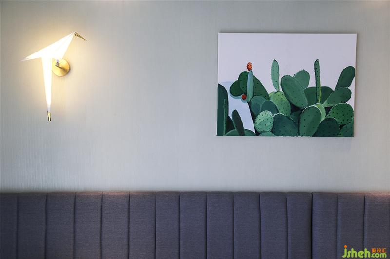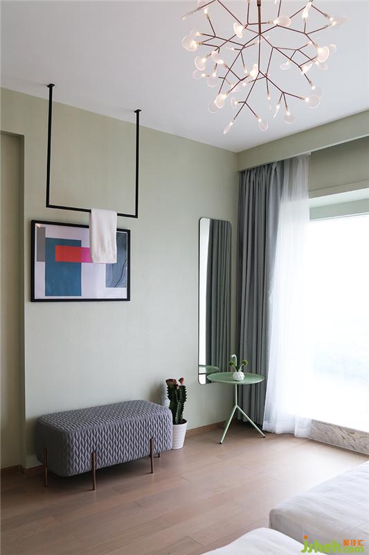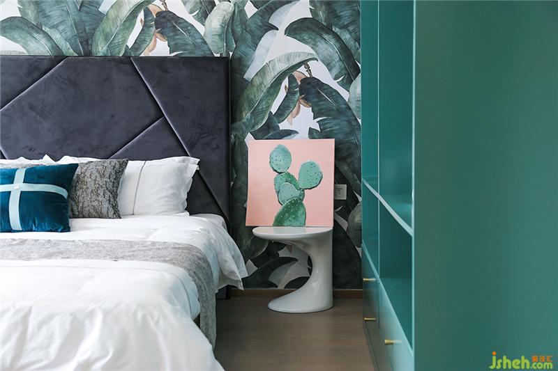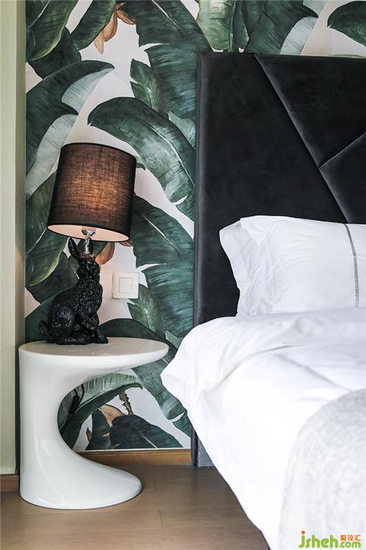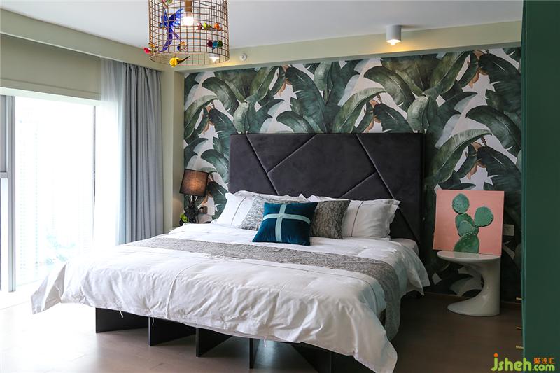 狂歡結(jié)束之后,來到二樓的臥室睡個好覺。日出時拉開窗簾,陽光灑在屋內(nèi),大塊芭蕉葉組合而成的背景墻更顯蔥郁。