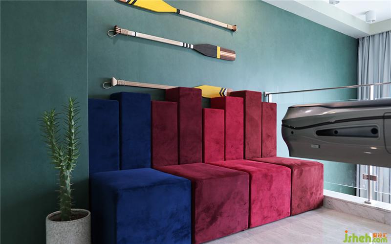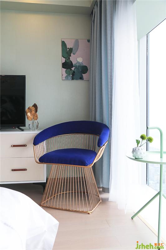 造型簡約的深藍(lán)色坐椅卓爾不群,優(yōu)雅的放在在落地窗旁,坐在上面望向遠(yuǎn)方,不禁沉迷于這江天一色。