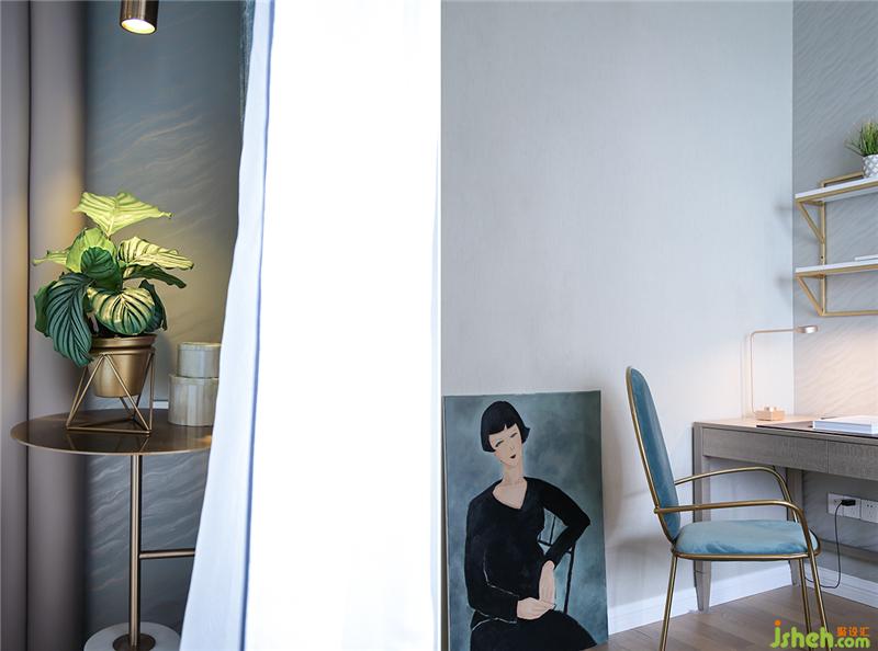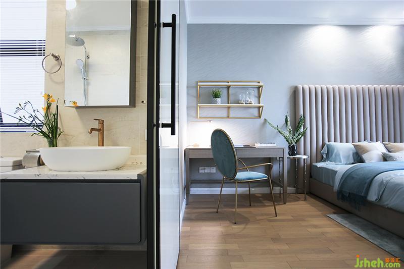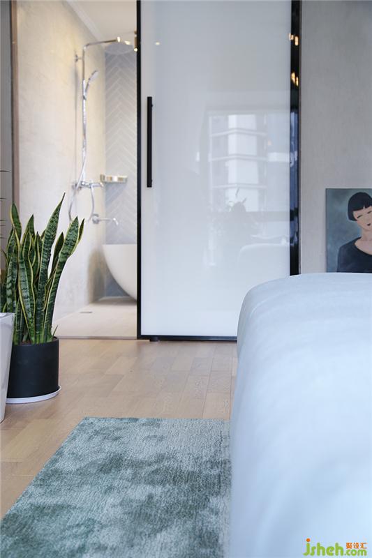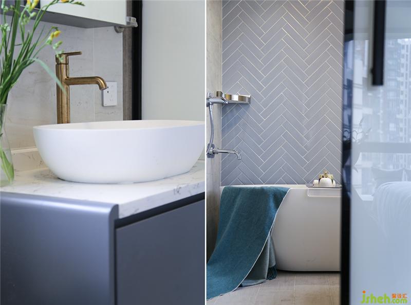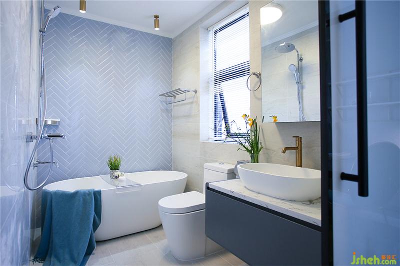 靠近衛(wèi)生間的浴缸墻面,使用淺藍(lán)色的人字拼磚,形成海面的波浪,泡澡的時(shí)候也能感受到海的味道。