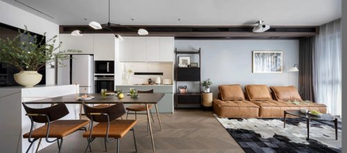 通過(guò)天花木飾面材質(zhì)和異形石材的視覺(jué)劃分,使得客廳的空間通過(guò)分區(qū)設(shè)計(jì)更加方正。主臥房門(mén)隱藏在客廳的背景墻面,整體明亮簡(jiǎn)潔的造型會(huì)讓空間看起來(lái)更加的開(kāi)敞,同時(shí)背景墻隱藏大量?jī)?chǔ)物空間,這也是兜兜需要的一種居住狀態(tài)。室內(nèi)設(shè)計(jì)師