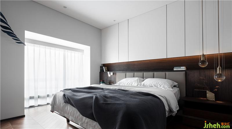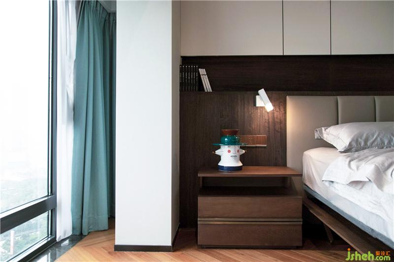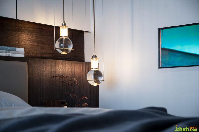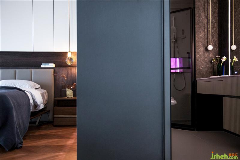 在主臥和主衛(wèi)相連的墻面上,開出28公分高1.8米長的長方形,使用彩色玻璃折射出鐳射效果,會隨著走入房間的位置變化產(chǎn)生顏色的變換,,同時通過主臥落地窗的自然光照射在主衛(wèi)的墻面,與范思哲黑大理石流金的質(zhì)地?fù)u曳生輝的裝修設(shè)計(jì)。