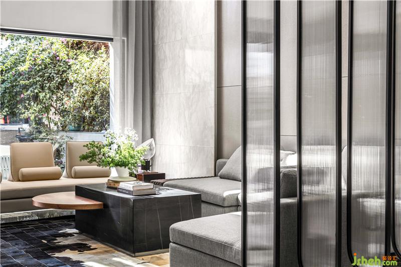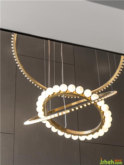 屏風隔斷是設(shè)計的一個點睛之處,戶型南北向進深較長,通過可旋轉(zhuǎn)的弧形的屏風設(shè)計,劃分空間,保持通透,增加空間層次和趣味,小燈芯的亞克力、木飾格柵、金色不銹鋼等元素,感官體驗中富有變化。