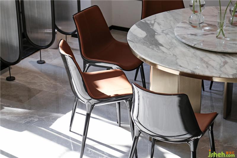 圓圓滿滿,三個(gè)孩子難免嬉鬧玩笑,家里人口比較多,基于安全,基于審美,基于布局使用圓桌是更合理的選擇,中西餐飲習(xí)慣的融合也以桌為載體在形上得到呼應(yīng)。