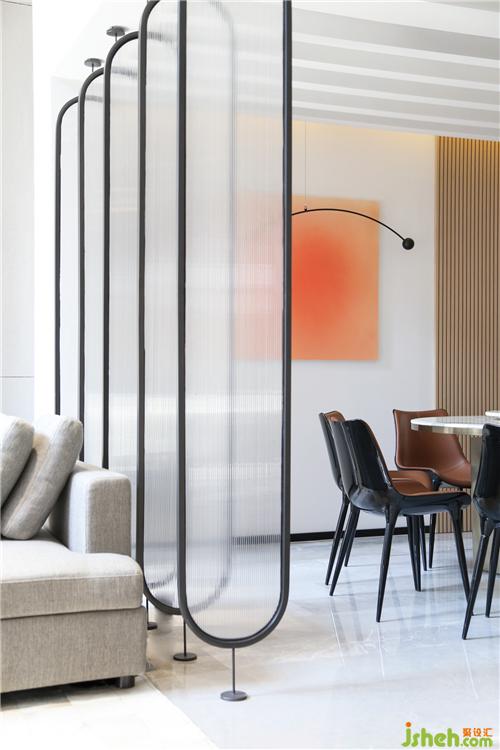 整個(gè)家圍繞通透、溫潤、浪漫這幾個(gè)關(guān)鍵詞展開,每一件物品都是精挑細(xì)選,恰當(dāng)?shù)谋憩F(xiàn)空間氣質(zhì)。東莞別墅裝飾在餐桌的正上方天花的位置有兩根低梁,通過矩陣的形式,與地面的屏風(fēng)形成L型的陣列。