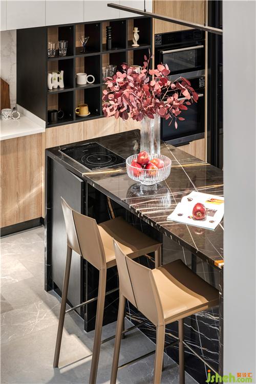 用餐環(huán)境安排的也很考究,中西廚相連電器和設(shè)備齊全,開放格里放滿了各式的杯子和廚房小物,足見屋主對生活的重視,屋主偶爾下廚的時(shí)候,三個(gè)小孩可以在一旁看媽媽下廚,或者做一個(gè)小幫廚,一起做烘焙。