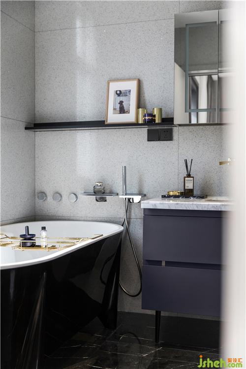 具有現(xiàn)代感的衛(wèi)生間使用黑白的色調(diào),水磨石自然簡潔的質(zhì)感,在空間里多了些細(xì)膩,少量的金色點(diǎn)綴恰到好處的品質(zhì)與內(nèi)涵,采用與墻體顏色統(tǒng)一的隱形門,起體現(xiàn)了空間的整體性,又保留了空間的開放感,契合現(xiàn)代簡約的設(shè)計(jì)。
