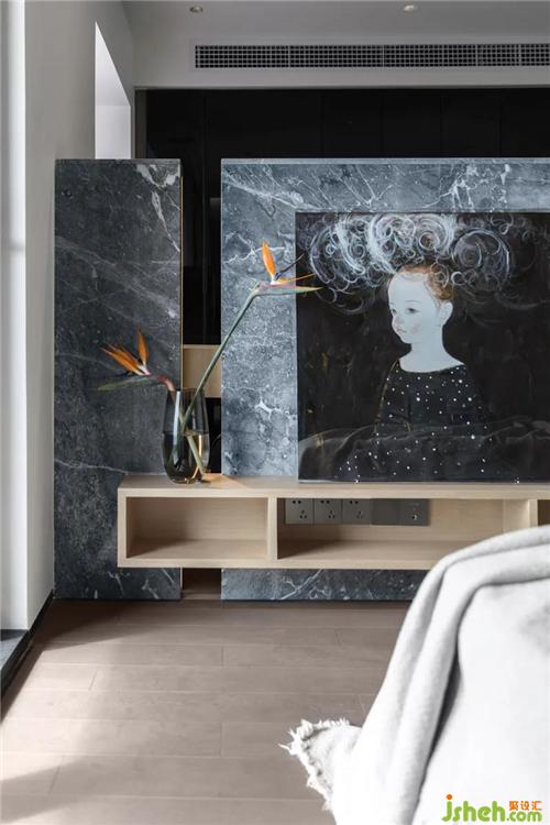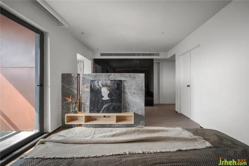 靠近主臥的房間與主臥打通,用于滿足屋主對(duì)于梳妝及衣帽間空間的需求深圳裝修設(shè)計(jì),整體更加開闊,在兩個(gè)空間之間做了一個(gè)半墻的設(shè)計(jì),后期可以懸掛電視。