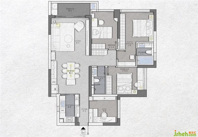整個房子的戶型比較方正,根據(jù)需求我們將原始戶型平面布局改動的最大的幾個點是: