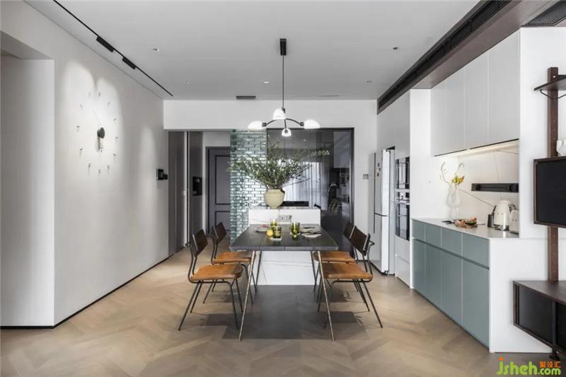 餐桌有樹木遒勁的力道與西廚的簡潔明朗,在審美上產(chǎn)生微妙的反差,沉淀歲月和現(xiàn)代簡明的融合十分耐看。餐桌連接的島臺是可以站在中廚位置打開的抽屜,補充了中西廚的收納功能,可以更好的分類收納。