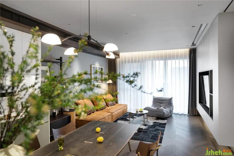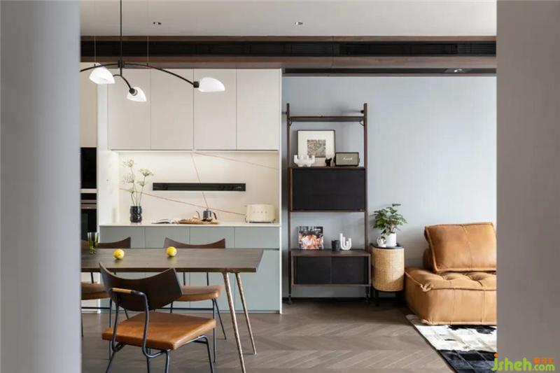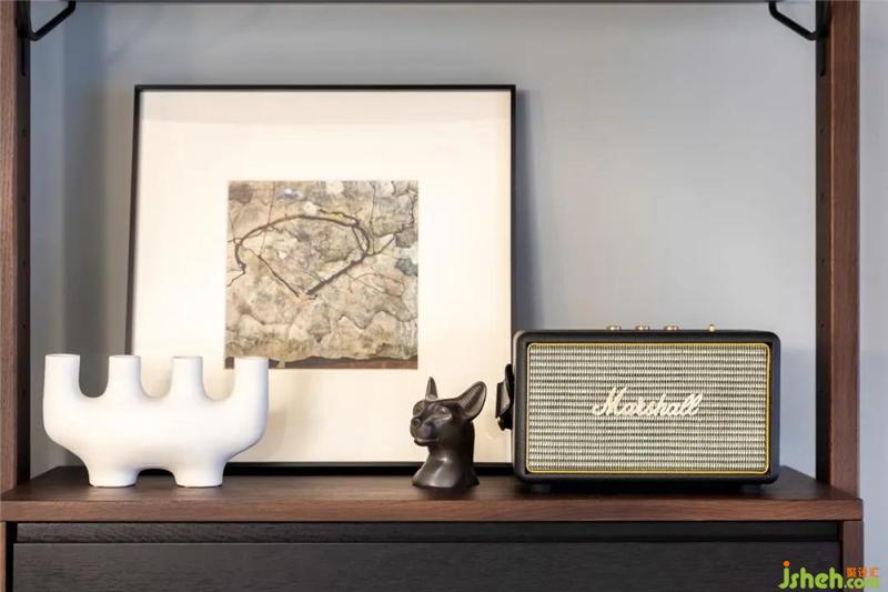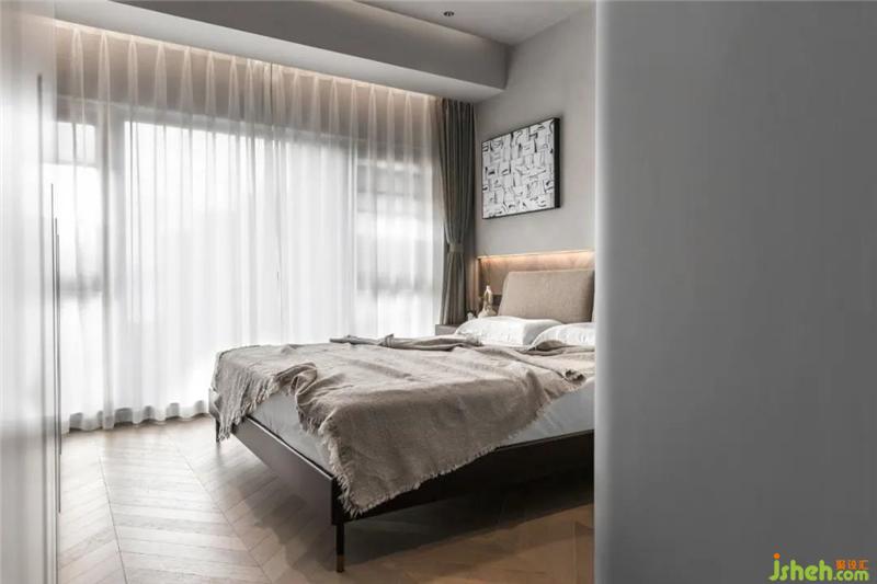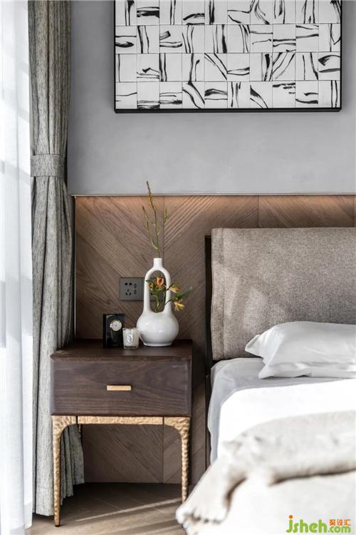 主臥的背景墻灰色與木色,一個(gè)溫暖一個(gè)冷靜和抽象的畫面形成空間構(gòu)成。