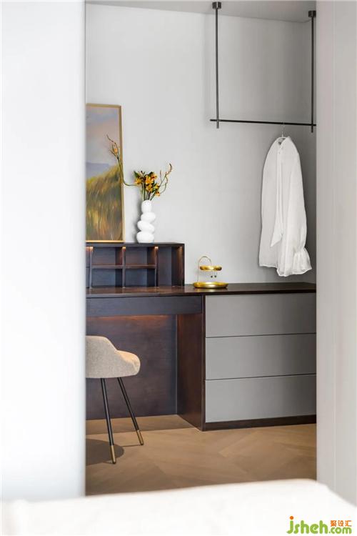 主臥的面積雖然不大,也被設(shè)計(jì)師擠出來(lái)一組衣帽間套件,4.2米長(zhǎng)的整排衣柜及多功能梳妝臺(tái),結(jié)合次凈衣+收納+梳妝臺(tái)+置物架+首飾盒的多種使用功能組合,足夠多的空間給女主放置衣服、化妝品、飾品等。