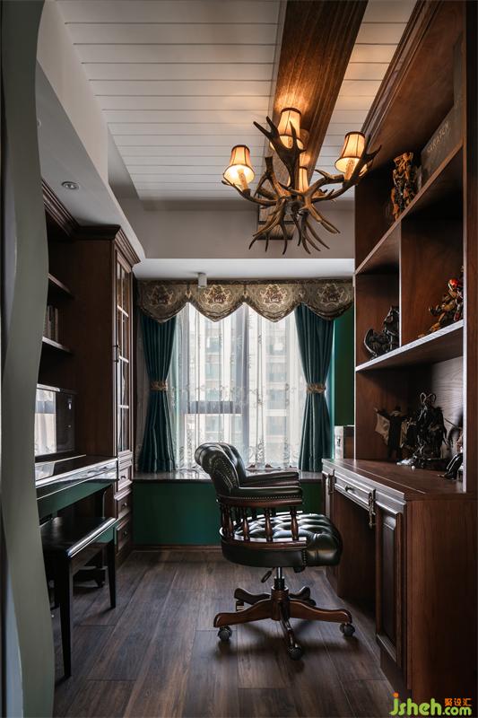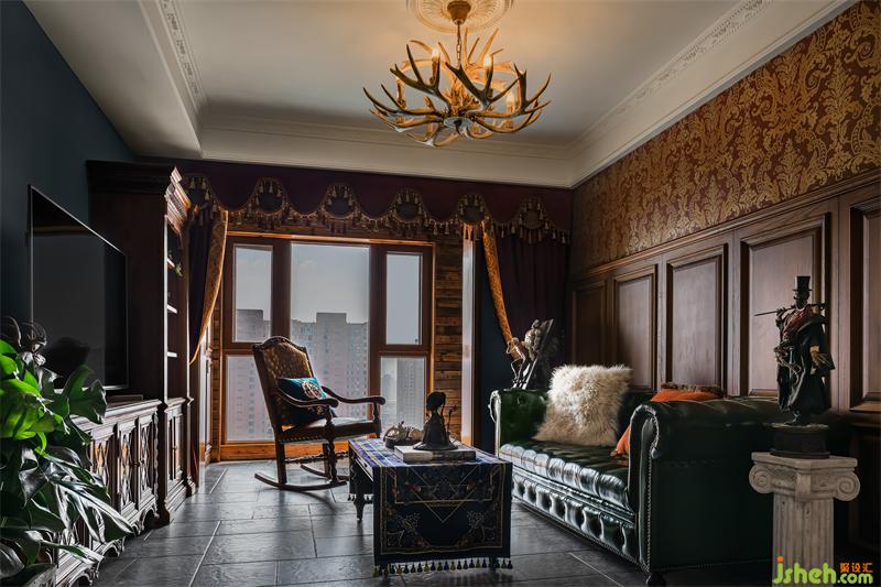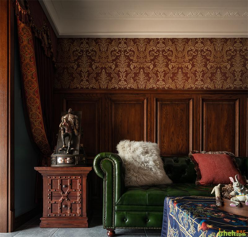 客廳采用了古堡里常用的墻板搭配大馬士革壁紙,華麗又復古,地磚也用了仿古磚,增加一點粗獷和滄桑感,沙發(fā)選用了墨綠色的切斯特菲爾德沙發(fā),搭配一把皮質(zhì)的搖椅,搖椅的靠背是皮毛的,溫暖又野奢,粗獷又舒適。沙發(fā)兩邊的手辦是家里最大號的兩個,用自己的心愛之物當裝飾,家就有了自己的味道。