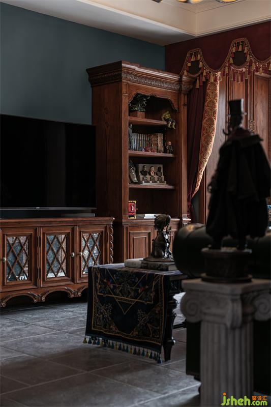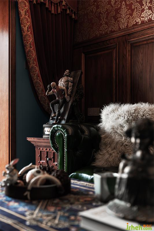 墻紙窗簾都用了復古的酒紅色系,與墨綠相碰撞,這種高飽和度的顏色對比更能體現(xiàn)古堡和宮廷的華麗和張揚,絲絨和羊毛材質(zhì)搭配溫潤的木頭,又能增加空間的質(zhì)感,更貼合古堡的風格,茶幾上的暗黑小丑兔邪惡又迷人~強行入鏡。