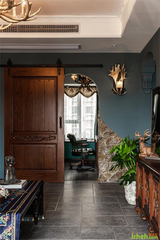 客廳看主臥。雕花的橡木谷倉門,搭配裸露出原石的破敗墻腳,仿佛一個久久無人問津的古堡里,隱藏著一個跨世紀的驚天大秘密……(此處有bgm~)鹿角壁燈昏暗的燈光既增加氛圍,也能在晚上照亮過道這一主動線,有顏又實用。