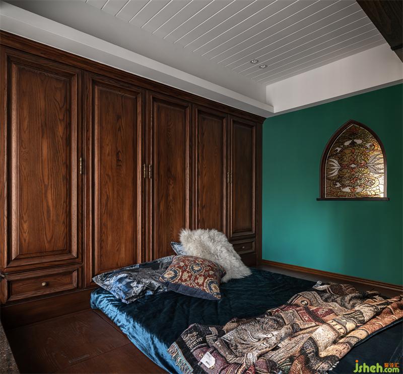 主臥采用榻榻米的形式,增加儲物,衣柜做成墻板的樣式,既是背景,又有實用性。墻上的教堂玻璃對著過道,增加過道的自然采光。
