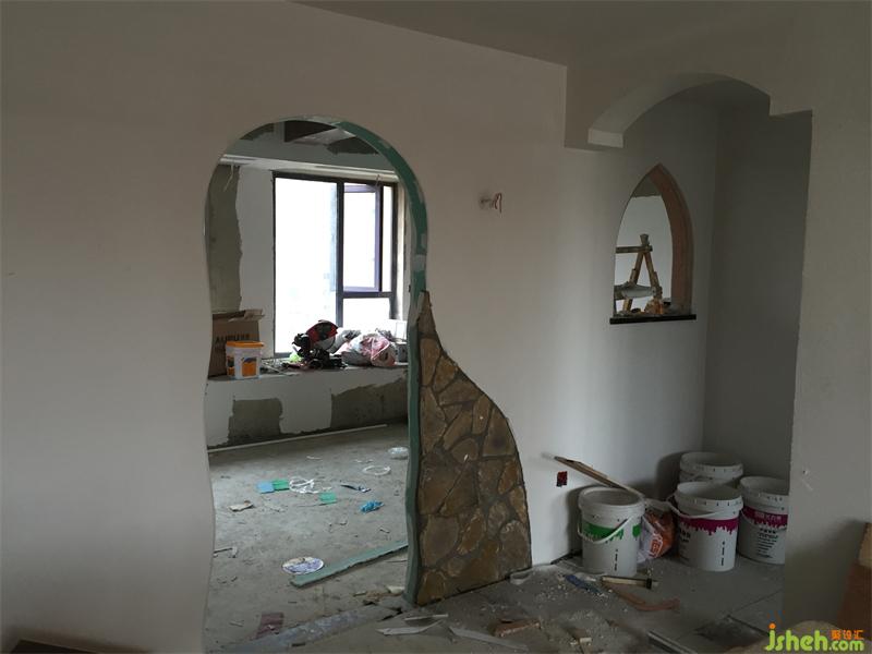 ▲施工階段。文化石是內(nèi)嵌進墻體,跟墻做平的,這樣才會有墻面破敗,粉層磨掉了露出原石墻腳的感覺,靈感出自《僵尸新娘》的電影場景。教堂玻璃需要做窗戶的木工師傅留出窗戶形狀的模板,按模板形狀大小定制玻璃。