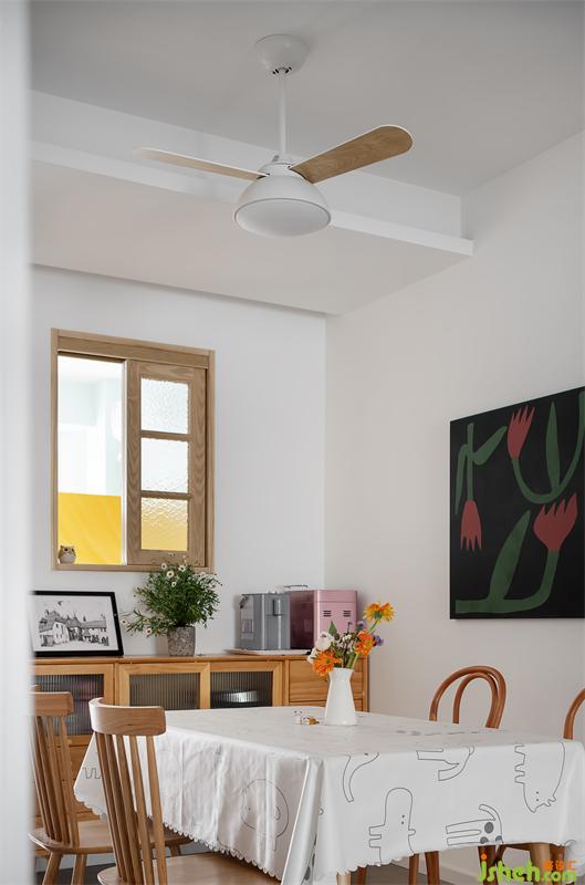 餐廳往兒童房借了一部分空間,放置了1米4的餐桌,以及一個(gè)大的實(shí)木餐邊柜,可以收納其他的烘焙工具,茶水問(wèn)題也可以在這邊解決,不再需要去廚房倒水。往兒童房的墻面開(kāi)了一個(gè)小窗戶,這樣南北都有采光,窗戶用了水紋玻璃,透光又保護(hù)私密性。白色的吊扇燈文藝又實(shí)用,一家人可以愉快地用餐啦~
