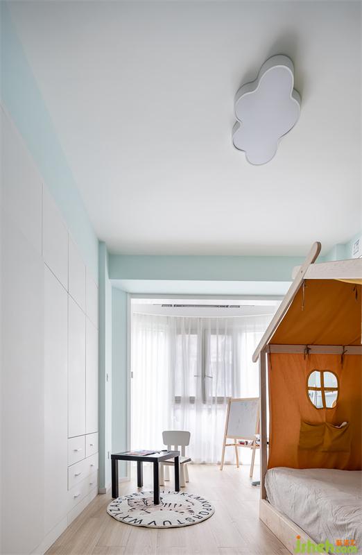 進(jìn)門左手邊就著柱子的厚度做了整排衣柜。下方幾個(gè)大抽屜可以收納玩具和娃娃,把小姑娘的心愛(ài)之物都集中起來(lái),好看又好玩的兒童房,讓孩子的獨(dú)立之旅更加容易。