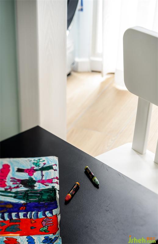 兒童房擴(kuò)大了通向陽(yáng)臺(tái)的門,把采光最大限度地引進(jìn)來(lái)。可愛(ài)的冰棍床可以滿足現(xiàn)在小朋友的身高,之后還可以拉伸成成人尺寸。繪畫桌椅和小畫板來(lái)自宜家。
