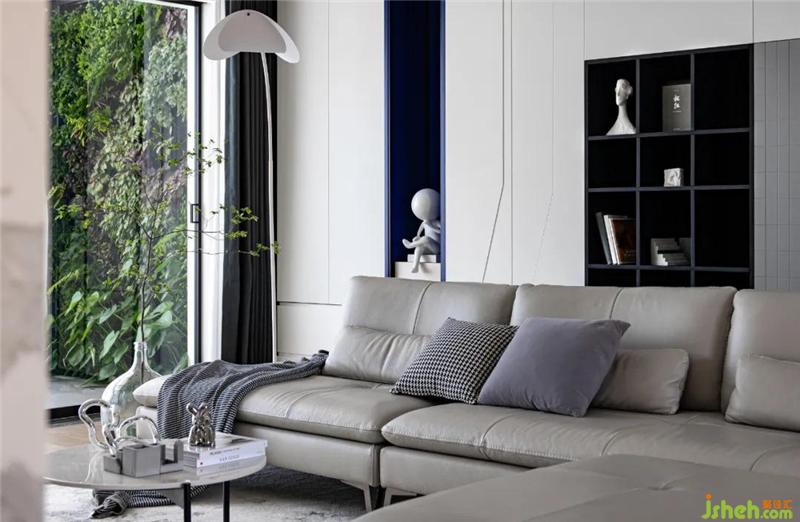 沙發(fā)后方的柜子是用一個(gè)大的框做的邊框,里面在有一些結(jié)構(gòu)的穿插,雕塑區(qū)域及展示柜區(qū)域鋼條的元素增加一些細(xì)節(jié)。背景以五種方式處理,開(kāi)放結(jié)合,以簡(jiǎn)單的材質(zhì)來(lái)呈現(xiàn)不一的設(shè)計(jì)手法,盒子里面的的擺件加上書(shū)籍在燈帶的作用下更是添加了藝術(shù)氛圍。