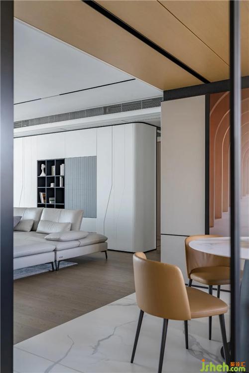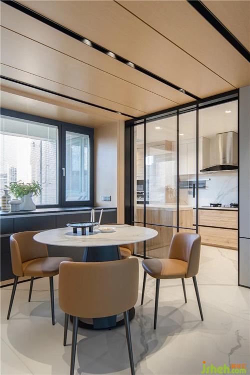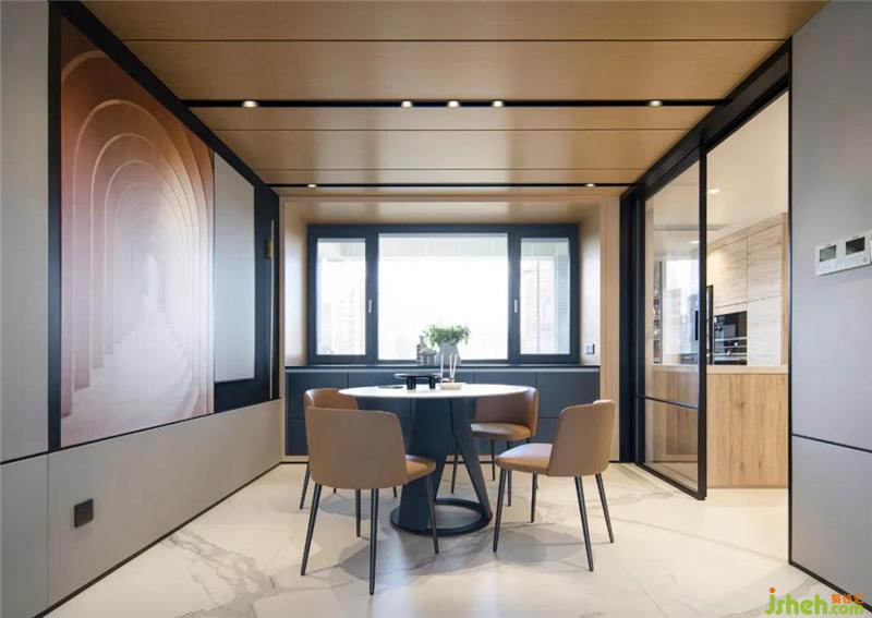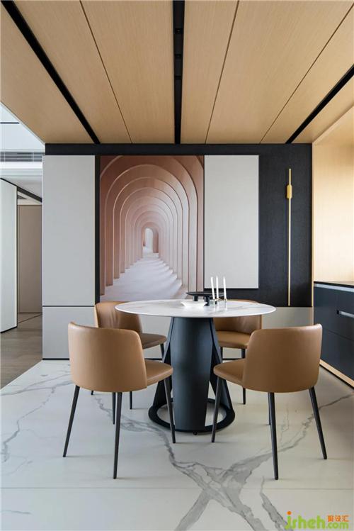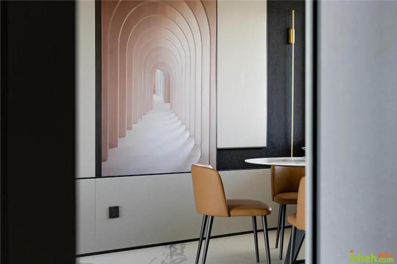餐廳絕佳的整體性從腰線背景延續(xù)到走道可以看出,門(mén)的處理方式不到頂,但是和上面的分色統(tǒng)一到餐廳,這樣不會(huì)覺(jué)得悶,層次又比較豐富。