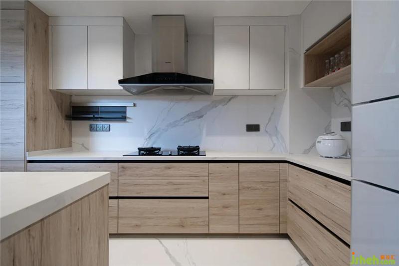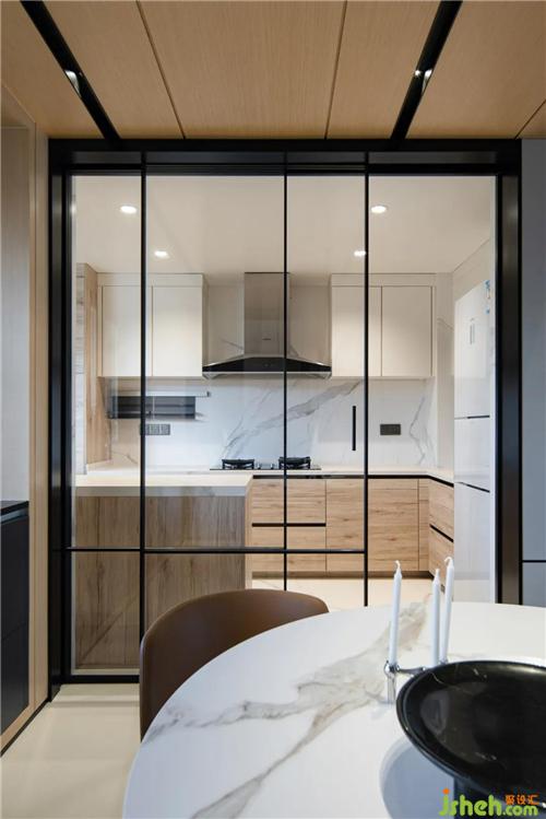 巖板材質(zhì)的地磚從餐廳通鋪到廚房延伸至墻面,提高空間的整體性,廚房門(mén)的線條也延續(xù)了餐廳的腰線,看似不經(jīng)意實(shí)則滿滿都是小細(xì)節(jié)~