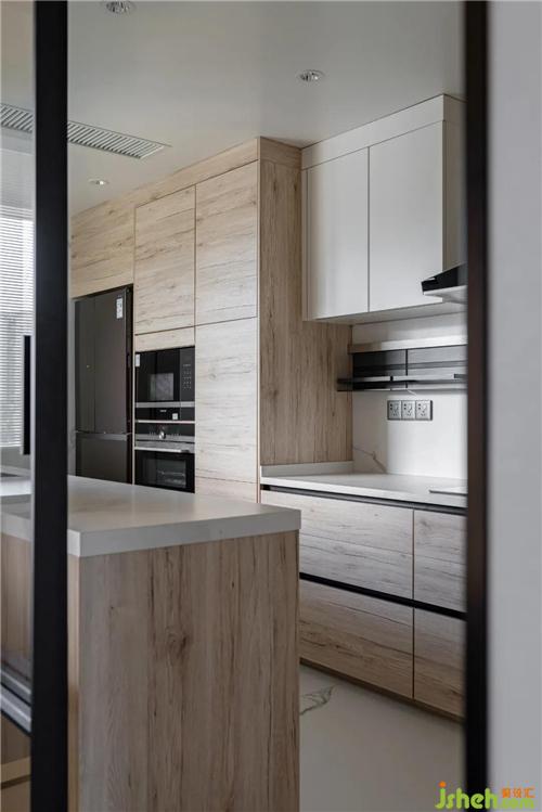 廚房整體以實(shí)木與巖板為主,巖板通鋪地面延伸至墻面,實(shí)木緩和了巖板帶來(lái)的冷冽。L型的廚房?jī)?chǔ)物與操作臺(tái)面本已足夠,在格局優(yōu)化的情況下多加了一個(gè)操作臺(tái)面,可容納多人下廚,也足夠收納屋主家一年四季的柴米油鹽醬醋茶~