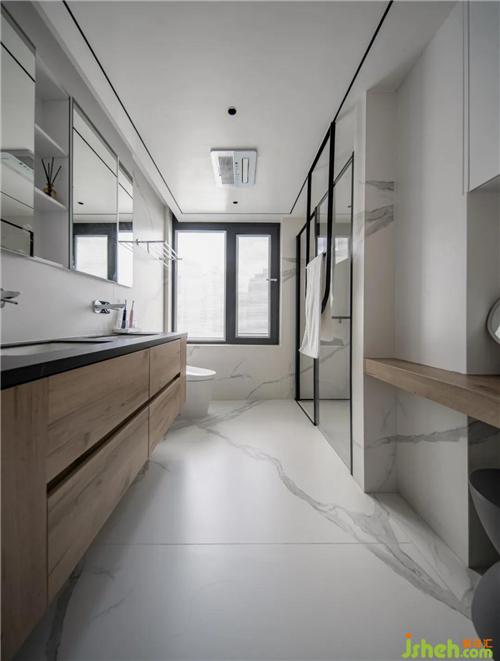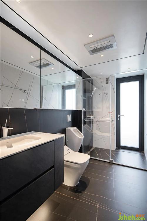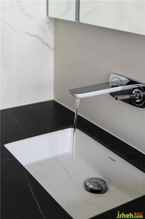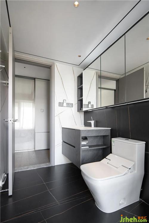客衛(wèi)也是由黑白的巖板通鋪地面延伸至墻面,彰顯低調(diào)的高級。洗手臺挨著馬桶一側(cè)設(shè)置了開放的儲物格,視覺上更加簡潔,使用感也更佳。