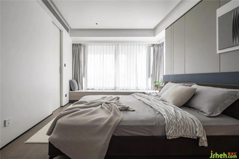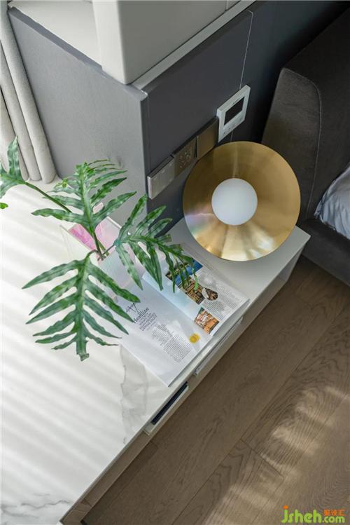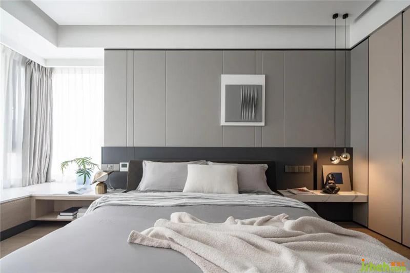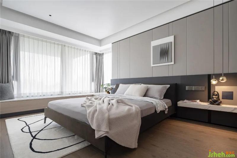 主臥整體比較素凈有質(zhì)感。L型的窗臺帶來絕佳的采光,兩側(cè)的床頭柜一側(cè)由窗臺延伸而出,一側(cè)由墻體蔓延,搭配簡約的吊燈與金屬感的臺燈,碰撞出的不規(guī)則美感。