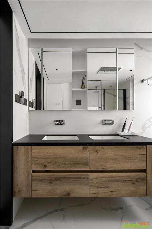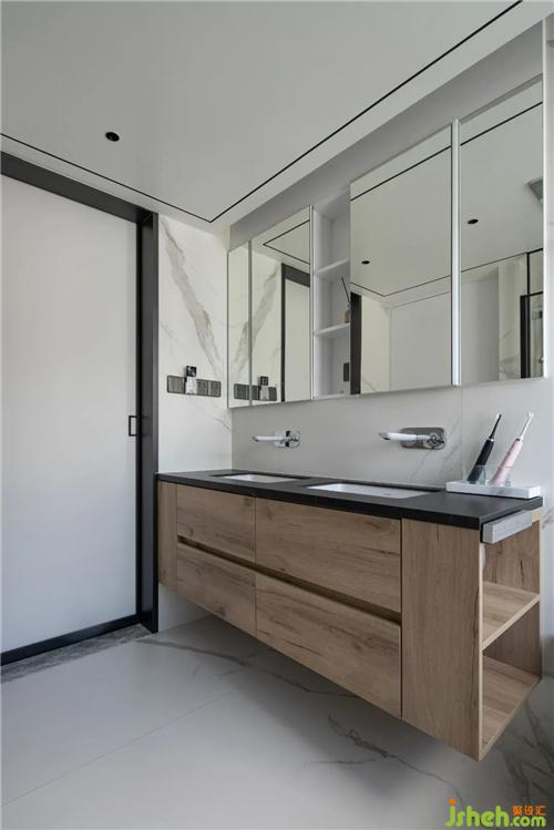 主衛(wèi)三件套滿足屋主的日常需求,另設(shè)置了雙盆,方便男女屋主的同時使用不產(chǎn)生沖突。與房子的整體風格一致,巖板也是通鋪地面及墻面,花紋拼接流暢,整體性更佳,更顯簡潔質(zhì)感。