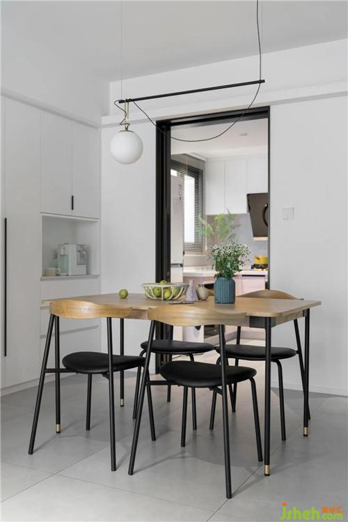 餐桌居中放置,讓四周形成環(huán)狀動線,活動方便。簡潔線條感的餐桌椅顯得輕盈,也方便衛(wèi)生的清潔。