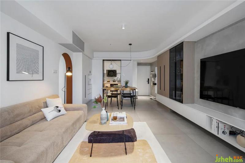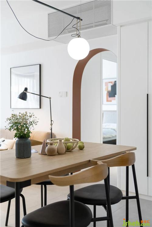客廳天花做了弧形處理,與過道處門洞相呼應。放眼過去,空間沒有被隔斷,視覺上開闊明亮,廚房與餐廳的動線更是便利了一日三餐。