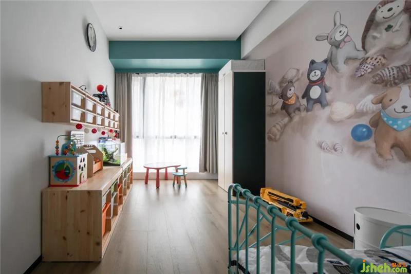隨著小朋友的成長(zhǎng),兒童房的布局會(huì)發(fā)生很大的變化,因此設(shè)計(jì)上并沒有什么固定的裝修或家具??看暗膲γ婧吞旎ㄋ⒌氖谴判云?綠色黑板漆,可以供小朋友涂涂畫畫。家具大部分是宜家,環(huán)保、功能加大,但又不太貴,方便根據(jù)需求變化而進(jìn)行調(diào)整。增加了很多插座位置以滿足日后隨著小朋友成長(zhǎng)、房間布局變化的需求。