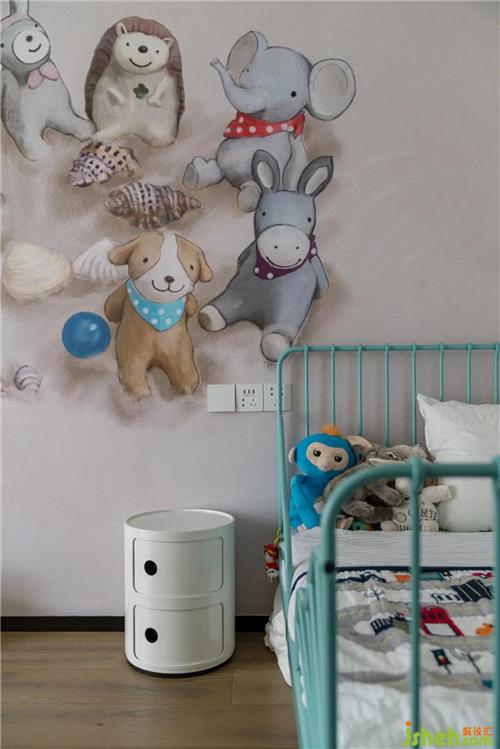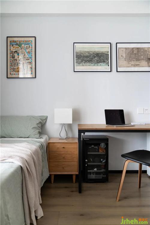 墻上用了整幅的壁畫,日后更換也很方便。床是宜家的伸縮床,可以從1.4米拉長(zhǎng)到2米。