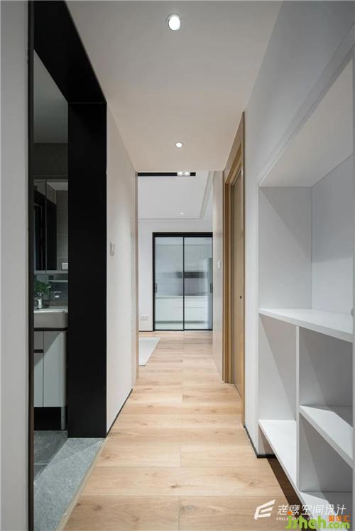 過道區(qū)域看向廚房,旁邊的柜子可作為一些物件的收納儲(chǔ)物,減少過道的深度感,增添一些可能性