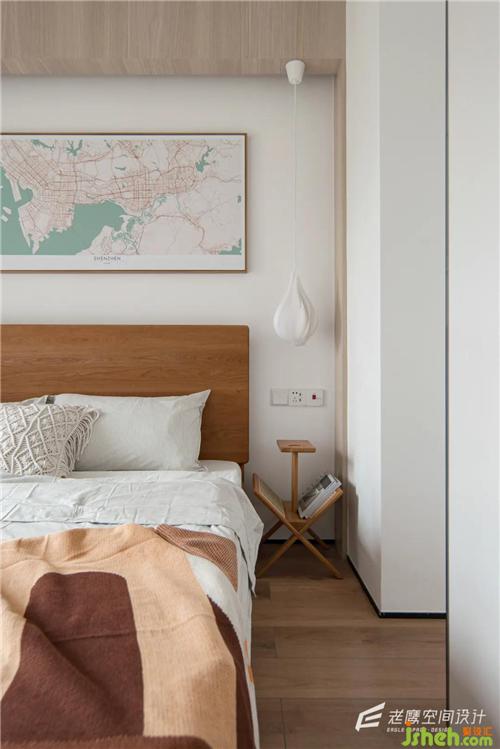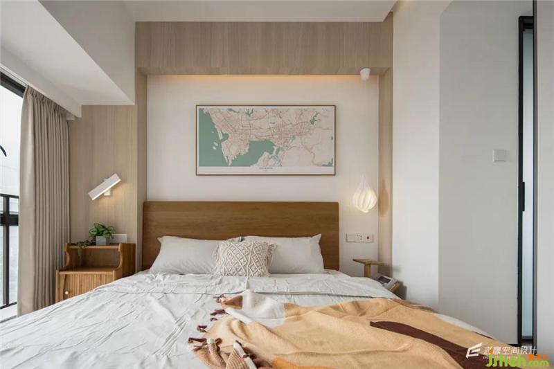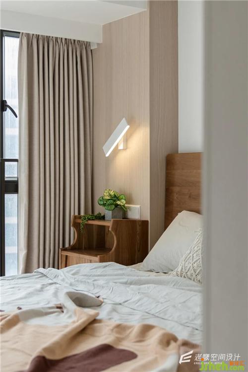臥室的色調(diào)及風(fēng)格與客餐廳一致,床頭背景木色區(qū)域結(jié)合三大體塊穿插設(shè)計(jì),在視覺上更加立體化,層次感滿滿,內(nèi)藏?zé)魩Ц邷剀胺諊鷡 在軟裝的選擇上,床具簡約的線條,加上柔和顏色的床品,既美觀又舒適~兩邊簡潔可調(diào)節(jié)的壁燈+吊燈組合,風(fēng)格一致而又個(gè)性明顯的床頭柜,不對(duì)稱的美感,增一分顯得多余,減一分顯得寡淡,一切都是美的剛剛好~