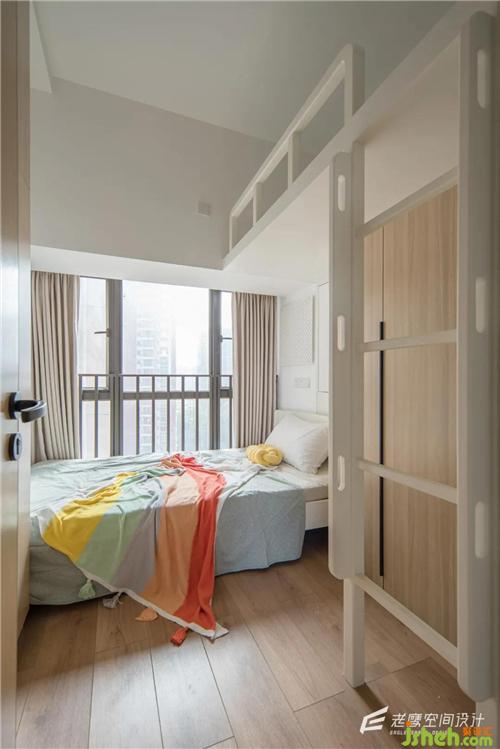 兒童房是錯位上下鋪的設(shè)計,上鋪的底部為衣柜區(qū)域,小小的空間也可以滿足儲物和日常使用的功能深圳室內(nèi)設(shè)計師,整個空間內(nèi)部還是以白色+木色為主,加上果綠的色調(diào)點綴,軟裝上用比較童趣的彩虹色,氛圍感十足