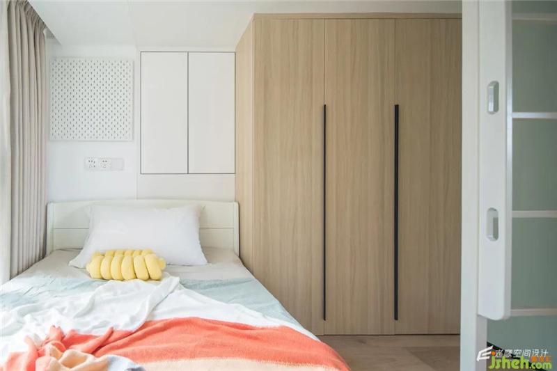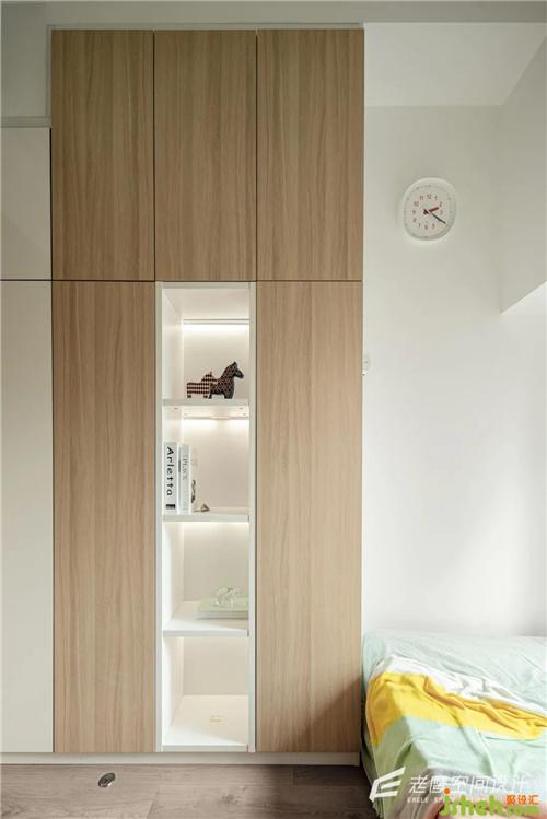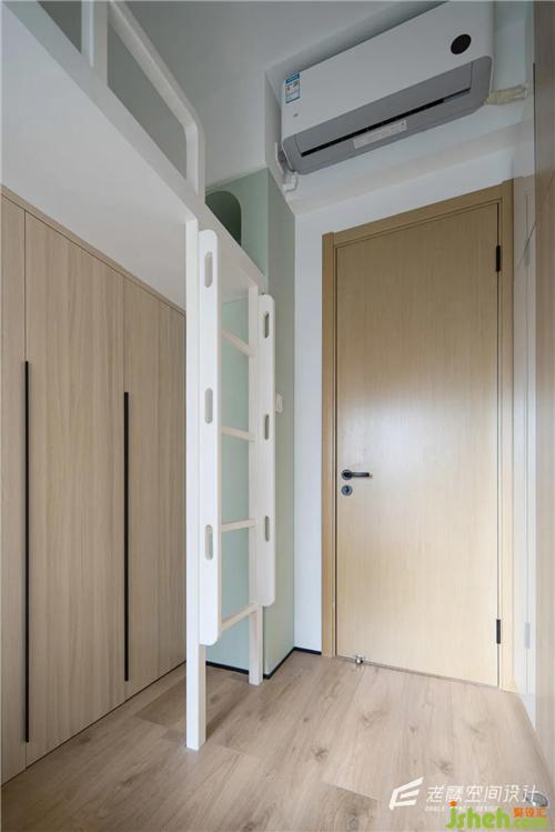另一邊也是柜子作為下鋪的主要儲物區(qū)域,為了避免儲物柜給空間帶來的壓迫感,在中間區(qū)域特意做了開放區(qū)域,靠門的位置為白色的柜子,兩種顏色搭配在視覺上更輕松~