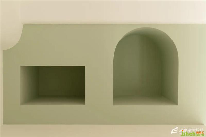 在上鋪的區(qū)域制作了兩個可愛造型的凹洞,可作為上鋪的床頭柜使用或者放置一些小物件。果綠色的墻體作為體塊獨立的存在,選用了其他顏色,給空間內(nèi)部增加一些童趣的氛圍~
