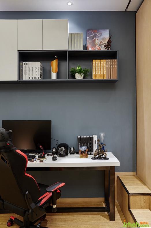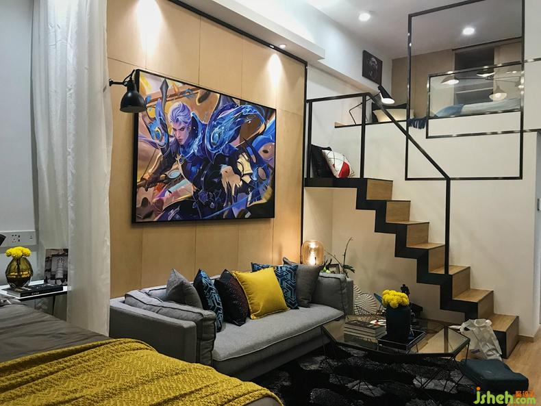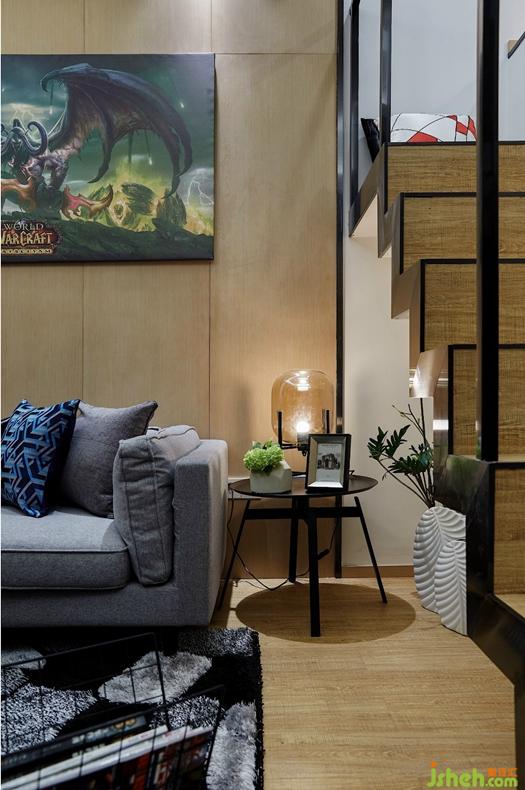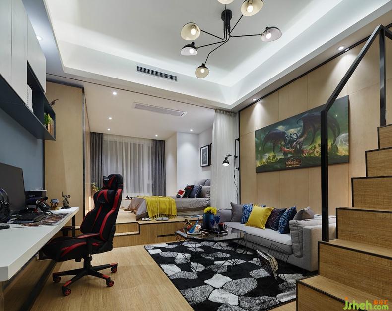 “電競”電子競技對于男士的吸引力也越來越大,電競時代主要為90年代群體 ,從80的“魔獸世界,奇跡”到現(xiàn)在的“英雄聯(lián)盟,王者榮耀,Dota”,男性同胞總是渴望有一片屬于自我放松在游戲世界里實現(xiàn)另一種自我價值的空間,我們在針對“電競”設(shè)計的同時,色調(diào)以中性色為主,高級灰為主色調(diào)的前提下,引入游戲人物及跳躍的色彩,豐富其空間。在此LOFT公寓空間高達(dá)而開敞,具有上下雙層復(fù)式結(jié)構(gòu),戶型內(nèi)的無障礙,透明性高,更具開放性,風(fēng)格也比普通住宅更多樣化,更具多樣性。