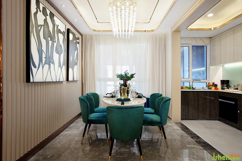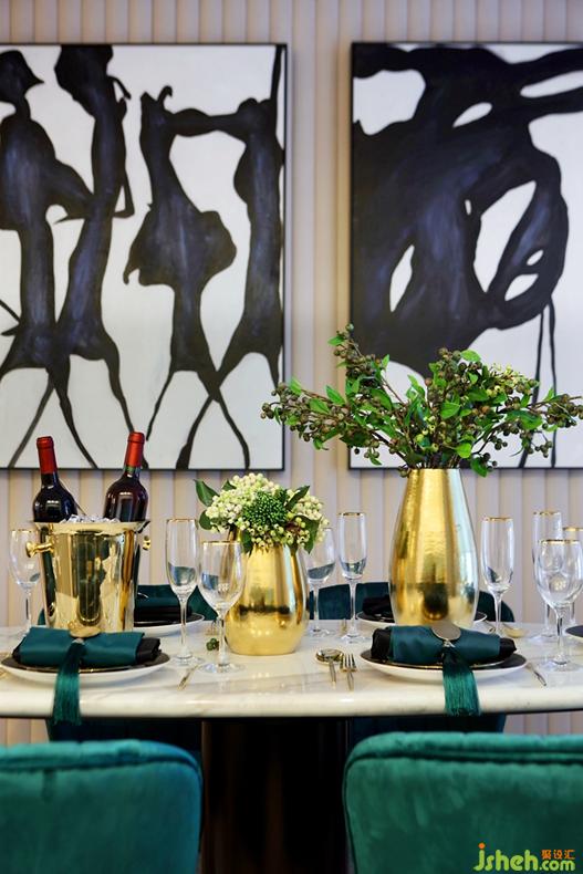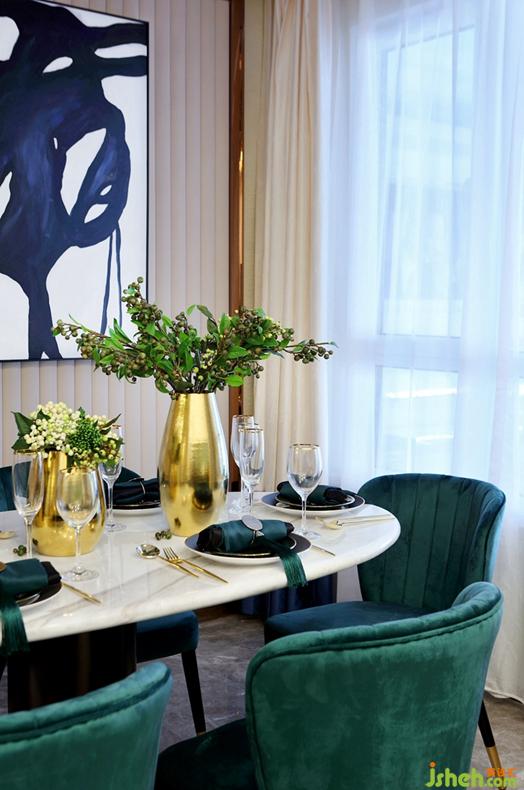 富有韻味的天鵝絨餐椅與金屬元素加以調(diào)和,極致的奢華魅力更是無法抵擋。