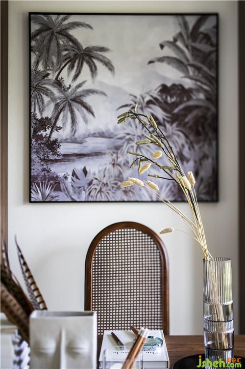 處處洋溢著的濃濃異域風,讓這個小家變身成為個性跳脫,浪漫自然的民宿風格,木面案幾、藤編草席、抽象裝飾畫和花瓶,簡單的搭配,卻是韻味滿滿,整個空間充滿呼吸感,非常適合休閑發(fā)呆。