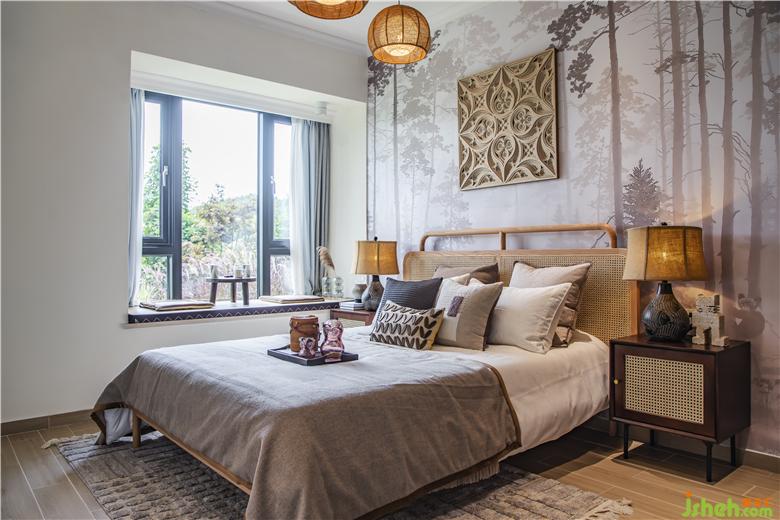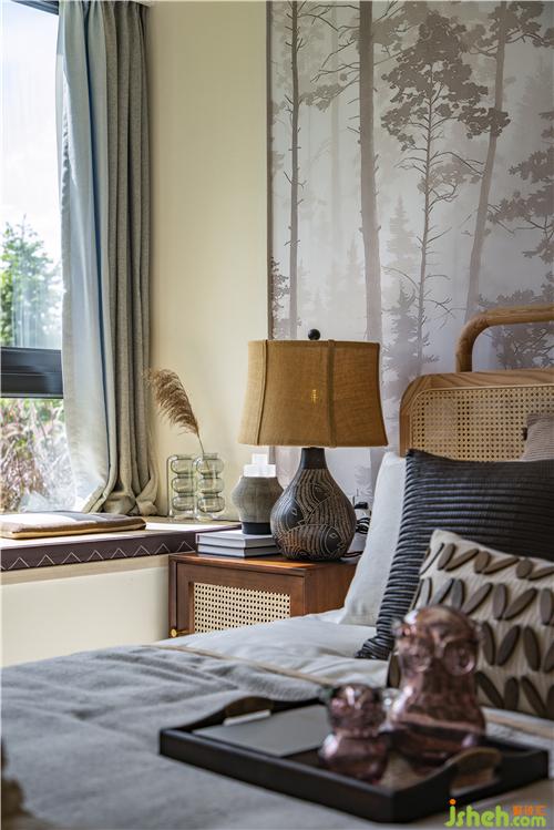 臥室墻面采用素色綴以復古紅,素雅之間又散發(fā)出摩登的復古感。天然藤編床為臥室增添了自然舒適的意味。精美的裝飾品讓一切柔和寧謐,沒有銳利的尖角,愜意休閑。