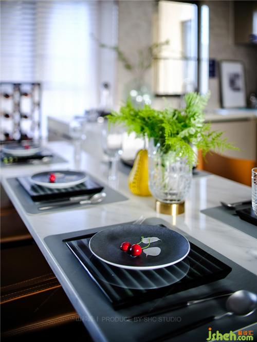 灰色空間沉穩(wěn)大氣,大理石透過光線折射出精致向上的生活態(tài)度,而愛馬仕橙色的配件則賦予空間尊貴的氣息。簾影斑駁,搖曳生輝,于朦朧中,享一方寧靜與奢華。