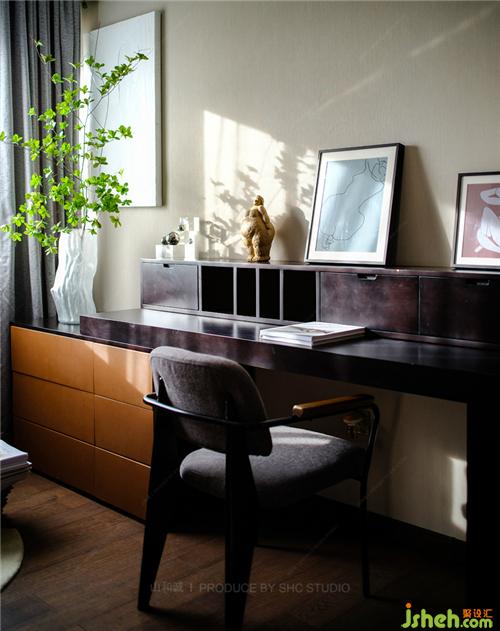 書房延續(xù)空間的整體色調(diào),作為男主人的個人空間,裝飾上更顯大膽,皮革、金屬石材、布藝增添層次感,局部配以時尚藝術(shù)品,不同的材質(zhì)與材質(zhì)與觸感都營造著室內(nèi)的高級精品與藝術(shù)感,彰顯男主人的格調(diào)。