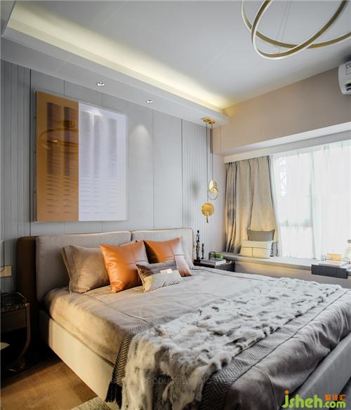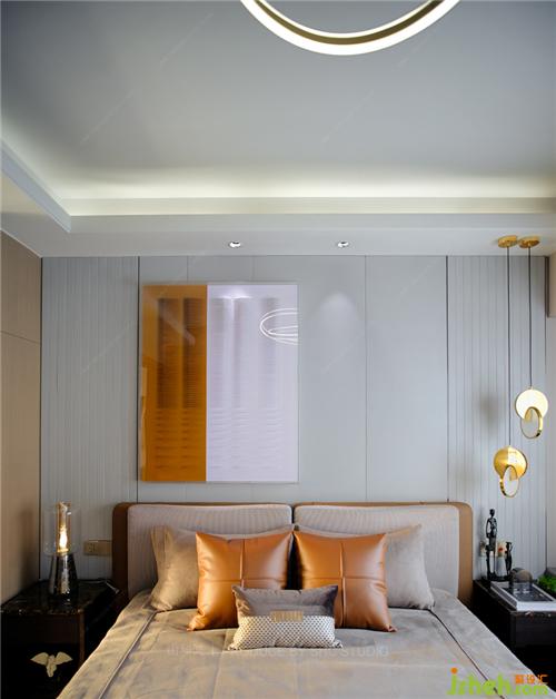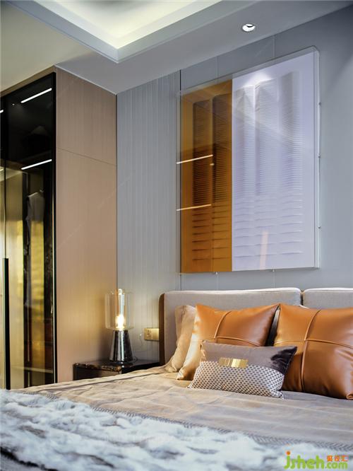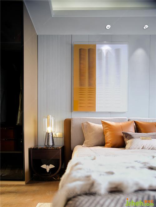 臥室內(nèi)灰白金的色彩對撞,盡顯高雅與浪漫。再配以溫暖舒適的床品,營造出居家的溫潤質(zhì)感。大理石桌面的床頭柜與皮質(zhì)的床上抱枕、優(yōu)雅高貴的皮草相輔相成,突出了整個空間的質(zhì)感,亦展示了女主人的高雅品味。