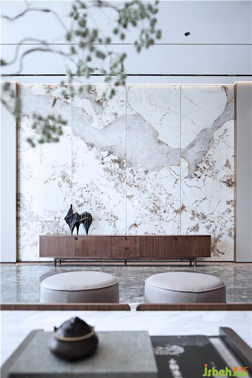 客廳電視背景,山水紋的巖板,淺深山色高低樹(shù),一片江南水墨圖