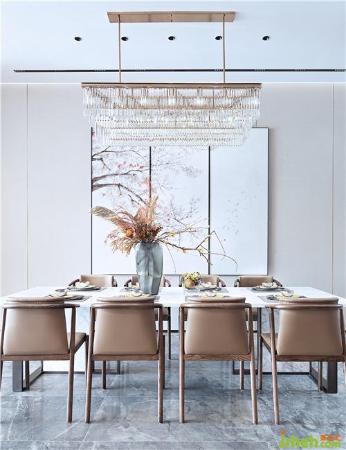 拾級(jí)而上來(lái)到大尺度大空間的主要區(qū)域會(huì)客餐飲區(qū)域,去掉以往的中式濃墨重彩,以素雅之姿安排家私及墻面畫(huà)作,盡管克制華麗、低調(diào)內(nèi)斂但是更具意境的新中式姿態(tài)確魅力不減。餐廳墻面的畫(huà)作與餐臺(tái)花藝古今對(duì)話相得益彰中更顯豐富悠然的生活氣息。樣板房設(shè)計(jì)