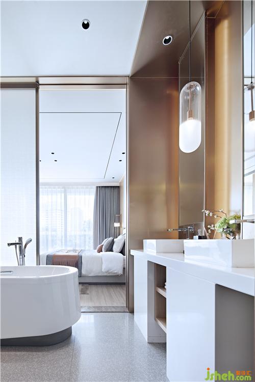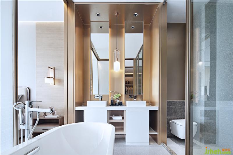 主衛(wèi)生間干濕分開,洗手臺背面材質(zhì)為不銹鋼,臺面人造石,燈光更注意細(xì)節(jié),有背景光,重點照明光和面部照明光。